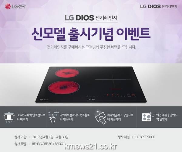 LG전자가 전기레인지 신모델 출시를 기념해 푸짐한 혜택을 준비했다. LG전자는 4월말까지 전기레인지 신제품(모델명 BEH3G, BEI3G, BEI3G1)을 구매하는 고객들에게 다양한 혜택을 제공한다.