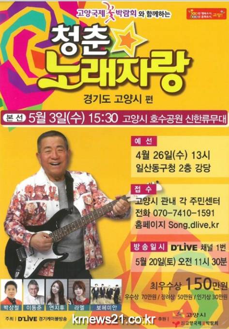 경기도 고양시는 다음 달 3일 호수공원에서 시민들이 직접 참여하고 즐길 수 있는 '고양국제꽃박람회와 함께하는 청춘노래자랑'을 개최한다고 11일 밝혔다.