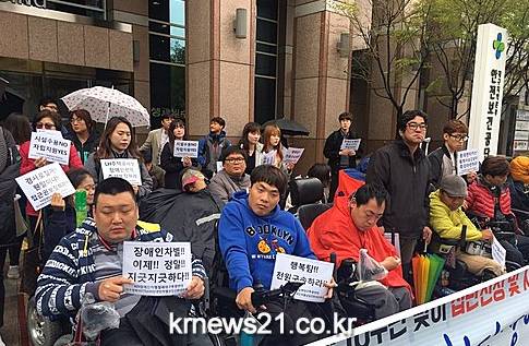 420장애인차별철폐대구투쟁연대가 11일 대구 중구에 있는 국가인권위원회 대구인권사무소 앞에서 기자회견을 열고 장애 차별철폐와 영역별 지원대책 마련을 요구하고 있다.
