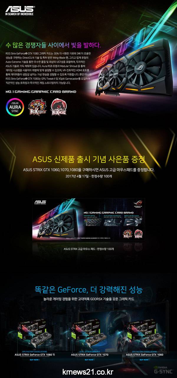 이번 ‘에이수스 그래픽카드-ROX TIGERS ROG 장패드’ 번들 프로모션은 ASUS GTX 1060 이상 그래픽카드 구매자를 대상으로 진행하며 18일부터 아이코다 외 주요 12개 쇼핑몰에서 참여할 수 있다.
