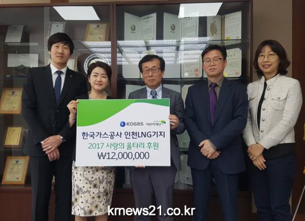 한국가스공사 인천LNG기지는 19일 인천LNG기지에서 연수구 관내 15개 지역아동센터소속 취약계층 아동들을 지원하기 위한 사랑의 울타리 후원금 1200만원을 초록우산 어린이재단 인천지역본부에 기탁했다.