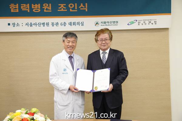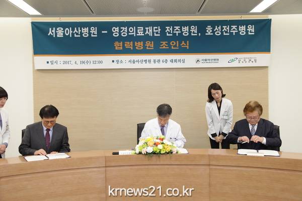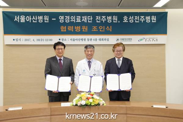 서울아산병원(병원장 이상도)과 의료법인 전주병원(병원장 임신호)·호성전주병원(병원장 김종준)은 4월 19일(수) 서울아산병원 동관 6층 회의실에서 진료협력 협약식을 체결했다고 밝혔다.