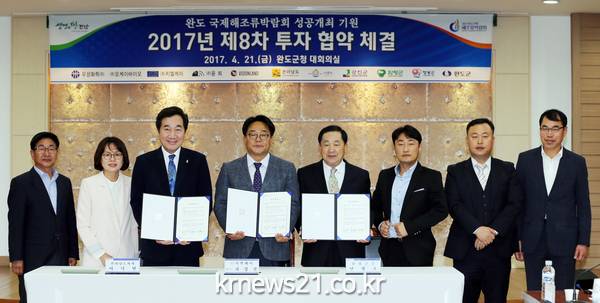 이날 완도군청에서 가진 협약식에는, 심기형 우성화학㈜ 대표, 최경철 ㈜지엘케이 대표, 정윤균 ㈜윤희 회장, 안광석 ㈜비전랜드 전무, 현해성 ㈜오케이바이오 대표, 이낙연 전남도지사, 신우철 완도군수, 안병호 함평군수, 김준성 영광군수, 이기춘 나주부시장, 안병옥 강진부군수 등 60여 명이 함께 했다.
