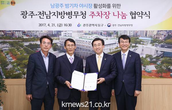 광주 동구(청장 김성환)가 지난 21일 광주·전남지방병무청(청장 장헌서)과 부설주차장 공유협약식을 맺고 남광주밤기차야시장 개장일에 병무청 주차장을 방문객들에게 무료 개방한다.