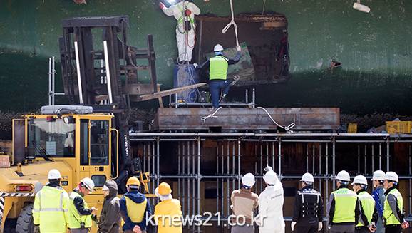 선체 내외에서 수거한 진흙 분리 작업도 이어진다. 전날까지 진흙 포대(포대당 1t가량) 265개를 수거했으며 이 가운데 90개에 대한 분리 작업을 마쳤다.