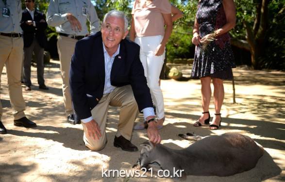 마이크 펜스 미국 부통령은 호주 시드니에 있는 타롱가 동물원에서 캥거루를 쓰담으며 미소를 짓고 있다. 아시아 태평양 지역으로의 첫 공식방문 일정의 일환이다