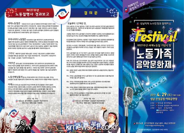 한국노총 성남지역지부(의장 전왕표)가 주관 및 주최하고 성남시가 후원, 성남이주노동자 및 성남시민이 함께하는 제127주년 세계노동절 기념식 및 노동가족 열린 음악제를 개최한다.
