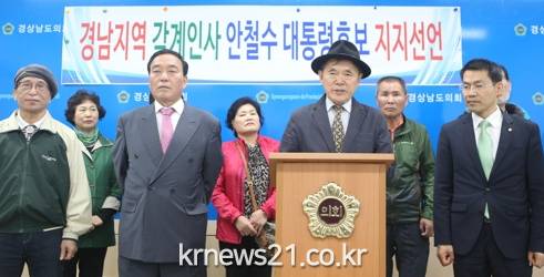 경남지역 각계 인사들이 26일 국민의당 안철수 대선후보를 지지하고 나섰다. 이날 경남 각계 인사 13명은 경남도의회에서 기자회견을 열고 "우리에게는 극단적 이념의 소유자가 아닌 조화로운 통합의 지도자가 필요하다"며 "경제·고용 위기를 극복할 수 있는 식견도 지니고 있어야 한다"고 말했다.