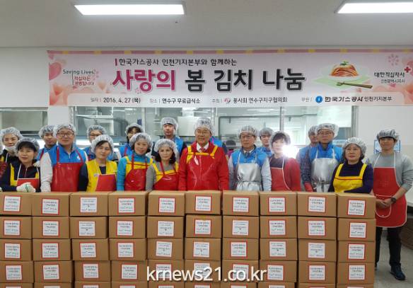 KOGAS 인천LNG기지와 연수구청은 가정의 달을 맞아 27일 오후 사랑의 무료급식소에서 저소득 노인들에게 나눠 줄 ‘사랑의 봄김치 담그기’ 봉사활동을 펼쳤다.