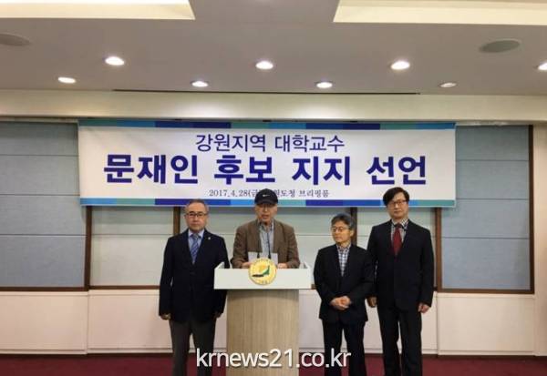 강원 지역 대학교수 114명이 28일 강원도청 브리핑룸에서 기자회견을 갖고, 더불어민주당 문재인 후보 지지를 선언했다.