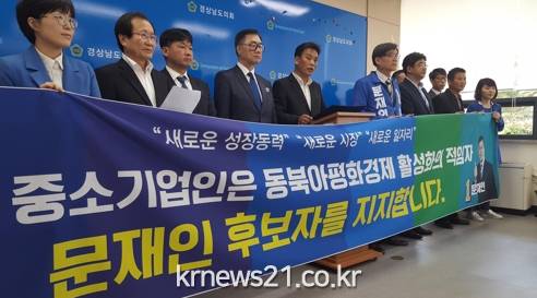 빈지태 개성공단입주기업 밴더업체 대표, 정재호 새롬전기 대표 등 10여명은 28일 경남도의회 브리핑룸에서 기자회견을 열고 "한반도와 동북아평화경제를 소망하는 경남 중소기업과 소상공인 150명을 대표해 문재인 후보 지지를 선언한다"고 밝혔다.