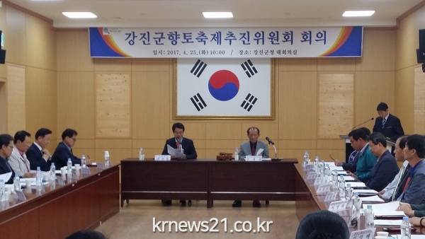 지난 25일 강진군 향토축제추진위원회가 청자축제와 관련 기본계획을 마련하고 보고하는 자리를 마련했다. 강진군청 대회의실에서 개최한 이번 회의에 강진원 군수를 비롯한 관내 기관단체장, 문화예술단체장 등 각계각층으로 구성된 28명의 축제추진위원이 참석했다.