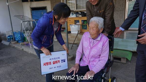 실버카는 가정의 달을 맞아 비아청년회원들이 마련한 것. 이날 회원들은 비아동주민센터에서 추천받은 어르신 가정을 직접 방문해 실버카를 전했다.