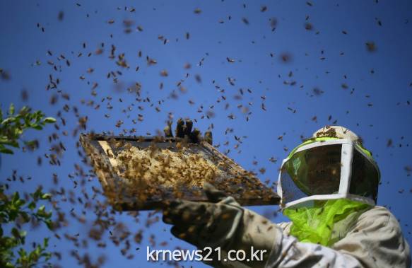 가자 지구 남부 라파에 있는 한 농장에서 팔레스타인 양봉농민들이 꿀을 모으고 있다
