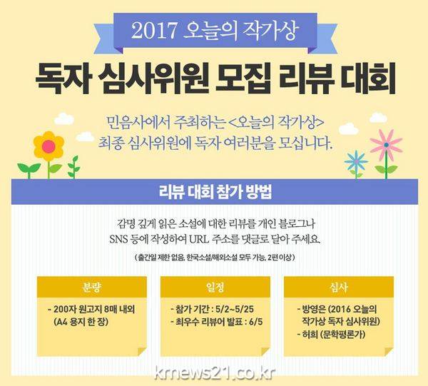 인터넷 서점 알라딘이 5월 2일부터 오늘의 작가상 주관사인 출판사 민음사와 함께 2017 오늘의 작가상 최종 심사를 맡아줄 독자 심사위원을 모집하는 리뷰대회를 연다고 밝혔다.