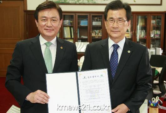 엑스포 조직위원장인 이시종 지사와 김병우 충북교육감은 4일 도지사 집무실에서 엑스포 성공개최를 위한 업무협약서에 서명했다.