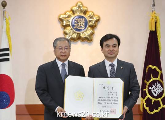 선관위는 문 대통령 당선안 의결 직후 더불어민주당 안규백 사무총장에게 당선증을 교부했다.