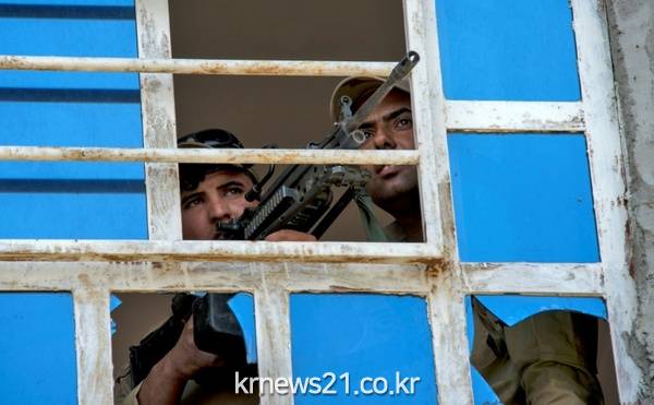 이라크 군인들이 모술 지역에서 경비를 서고 있다. 모술 지역은 아직 이라크 군과 IS간의 교전이 벌어지고 있는 곳이다.