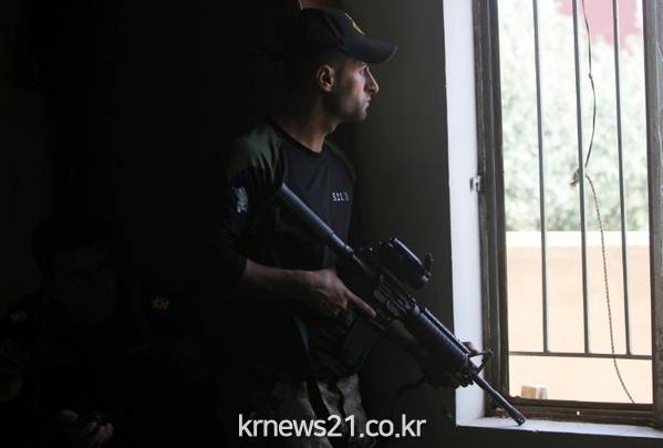 모술의 알-오라비(Al-Oraibi) 서부지역으로 진격한 이라크 대테러 부대원이 건물 내부에 서있다.