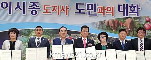 15일 오전 충북 보은군청에서 열린 충북도와 보은군, 보은지역 관계기관 등의 '미래로 향하는 충북, 세계 속의 충북 실현을 위한 실천 협약식'에서 대한적십자봉사회보은지구협의회 박학순 회장, 보은군자율방범연합대 강문수 대장, 정상혁 보은군수, 이시종 충북지사, 보은군자원봉사센터 김순자 소장, 보은청년회의소 이준기 회장, 자유총연맹보은군지회청년회 김지창 회장(왼쪽부터) 등이 협약서를 들어보이고 있다.