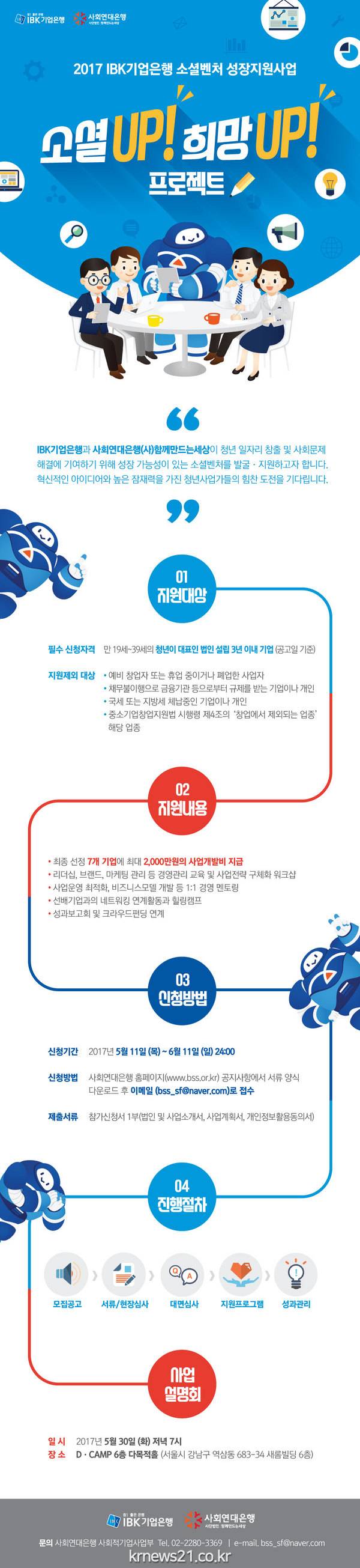 이에 앞서 5월 30일 서울 강남구 역삼동 D.CAMP에서 사업설명회를 진행할 예정이다. IBK기업은행은 이번 사업과 관련해 청년실업과 사회문제에 대한 창의적 해결을 위해 사업을 지원하게 됐다며 소셜벤처의 지속가능성 확보를 통해 청년층의 일자리를 창출할 수 있을 것이라고 기대감을 밝혔다.