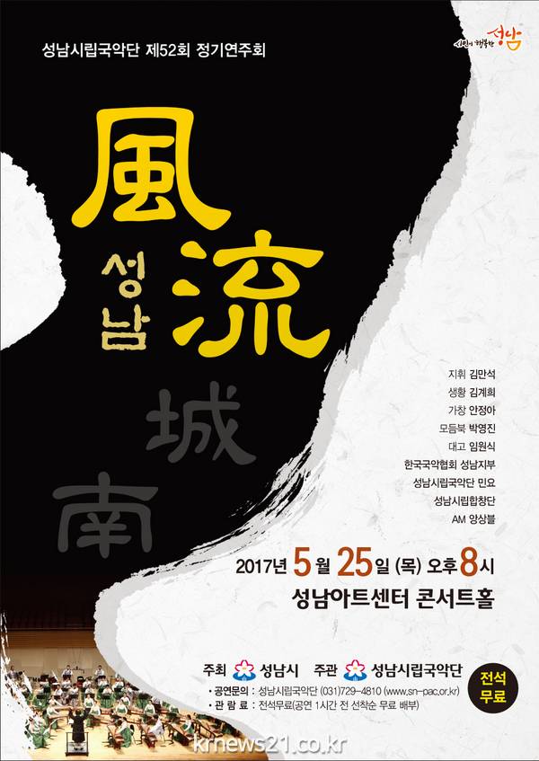 가정의 달 5월을 맞이하여 성남시 지역의 대표적인 국악축제로 2017년 5월25일 목요일 오후8시 성남아트센터 콘서트홀에서 제52회 정기연주회 ‘성남풍류’를 공연한다.