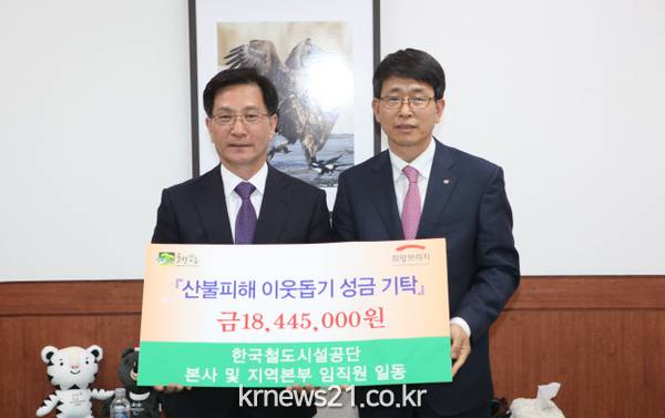 ▲ 노병국 공단 강원본부장이 강릉시청을 방문, 최명희 강릉시장에게 성금을 직접 전달하는 모습한국철도시설공단이 지난 16일 강릉시청에서 강원도 산불로 인해 주택소실 등의 피해를 입은 이재민들에게 약 1800만원의 구호 성금을 전달했다고 17일 밝혔다.