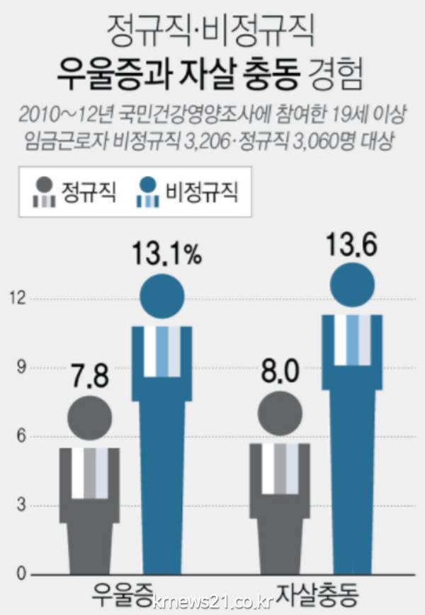 연구 결과 국내 비정규직 근로자의 우울증 유병률은 13.1%로 정규직(7.8%)의 1.7배 수준이었다. 비정규직은 7명 중 1명, 정규직은 13명 중 1명꼴로 우울증을 앓는 셈이다. 자살 충동 경험도 비정규직은 13.6%가 경험했다고 밝혔지만 정규직은 8.0%로 차이가 있었다. 비정규직 근로자는 고용 불안정성, 낮은 임금 수준, 위험한 근로환경의 영향을 많이 받았다.