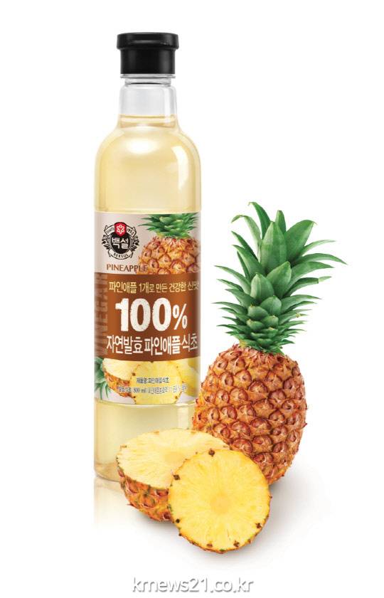 CJ제일제당에 따르면 이번에 출시한 백설 파인애플 식초는 주정과 인공첨가물을 사용하지 않고 과일만으로 발효한 천연발효 식초다. 800ml 한 병에 1kg짜리 파인애플 1개의 영양성분이 담겨있다.