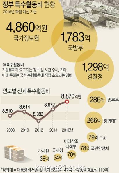 기획재정부에 따르면 지난해 정부 기관에 편성된 특수활동비는 총 8870억원으로 국정원(4860억원)과 국방부(1783억원), 경찰청(1297억원), 법무부(285억원), 청와대(265억원) 등이 상위권을 차지하고 있다. 특수활동비는 기밀 유지가 필요한 정보 수집이나 사건 수사 등에 쓰이는 경비로, 정보 제공자에 대한 사례금이나 활동비 등으로도 사용된다. 편성 단계부터 총액으로만 편성돼 집행 후에도 그 세부 내역이 공개되지 않는다. 이렇다 보니 본래 취지와 다르게 사적인 용도로 쓰거나 비용을 부풀리는 경우가 많다는 지적이 계속 제기돼왔다.