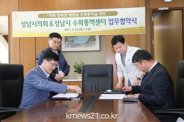 성남시의회(의장 김유석)는 5월 25일 의장실에서 성남시수화통역센터와 업무 협약식을 체결했다.