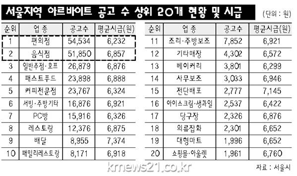 ▲ △서울지역 아르바이트 공고수 업종별 평균시급 / 자료=서울시시급으로 환산할 경우 7500~8000원 수준이다. 차지운 유안타증권 연구원은 "이마트가 1만원의 최저임금에 도달하기 위해 요구되는 3년간 평균 임금상승률은 7.7~10.1%다"면서 "지난해 기준 해당 근로자에 대한 급여가 7.7~10.1% 상승할 경우 213억~261억원의 비용이 추가된다"고 말했다.