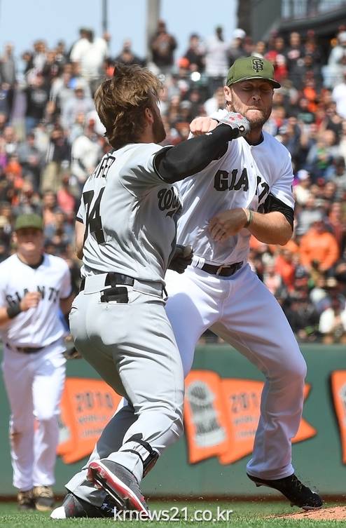 5월 30일(이하 한국 시간) 미국 캘리포니아주 샌프란시스코 AT&T파크에서 열린 샌프란시스코 자이언츠와 워싱턴 내셔널스와의 경기. 벤치클리어링의 주인공을 바로 브라이스 하퍼였다.