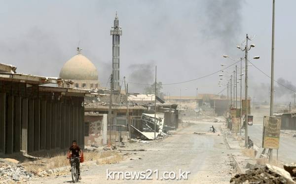 이라크 모술 알 사하 서쪽에서 자전거를 타고 있는 소년 뒤로 도시를 탈환하려는 정부군과 IS와의 전투로 연기가 올라오고 있다. 이라크 군은 전투지역 민간인들에게 대피할 것을 촉구했다.