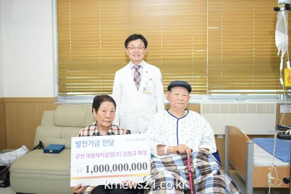 군산시 소룡동에 본사를 둔 군산대왕제지공업(주)은 현재 군산에 3개 공장과 충남에 2개 공장 서울영업소 1개를 운영하고 있는 탄탄한 중견 황토기업으로 기업 재무구조의 건전성, 투자증대를 통한 고용창출을 통해 지역경제 발전에 많은 이바지를 하고 있다. 군산제지 공장의 말단 사원으로 시작해 제지산업 외길 70년을 걸어오며 현재의 군대왕제지공업을 일군 김 회장은 탁월한 경영활동 뿐만 아니라 장학사업 등 지역사회와의 동반 성장을 위한 각종 사회공헌 활동으로 진정한 노블리스 오블리제의 표본이 되고 있다. 이번 발전기금 기부는 전북대병원을 이용하고 있는 김창규 전순안 회장 부부가 성심껏 치료해 준 병원에 대한 고마움과 지역 거점병원인 전북대병원 발전을 통한 지역민의 건강증진을 기대하는 따듯하고 큰 사랑이 담겨있다.