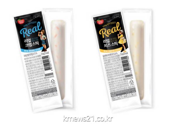 '리얼 크랩스틱'은 알래스카 청정 해역에서 잡은 자연산 명태 연육에 국내산 붉은 대게살을 넣어 진짜 게 맛을 느낄 수 있다. '리얼 치즈스틱'은 고급 체다치즈를 더해 고소하고 부드럽다.