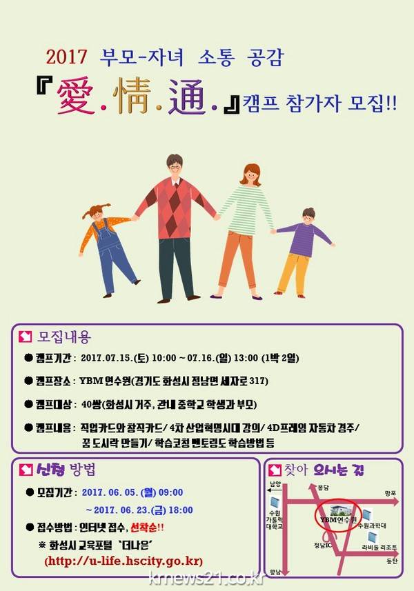 화성시가 부모와 자녀의 건강한 소통을 돕고 자기주도 학습법을 익힐 수 있는 ‘2017 부모-자녀 소통 공감 애정통(愛情通)캠프’참가자를 모집한다.