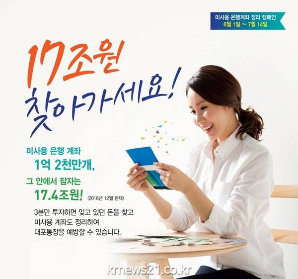 오래도록 사용하지 않거나 거래가 드문 휴면계좌가 1억2천만계좌, 금액으로는 17조원에 달하는 금융소비자들의 자산이 잠자고 있는 상황에서 감독당국과 은행권이 미사용 은행계좌 정리하기 공동 캠페인을 전개한다. 이번 캠페인은 6월1일부터 7월14일까지 6주간 진행되며 전 국민을 대상으로 미사용계좌 확인 및 정리를 집중적으로 홍보한다.