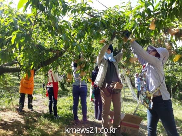 ▲ △충북도청 여성공직자 모임인 목련회는 3일 청주시 현도면 농가를 찾아 봉숭아 봉지 싸기 일손을 돕고 있다.충북도청 여성공직자 친목단체인 목련회(회장 오숙영) 회원 14명은 3일 청주시 서원구 현도면의 한 농가에서 복숭아 봉지 싸기 일손봉사 활동을 펼쳤다.