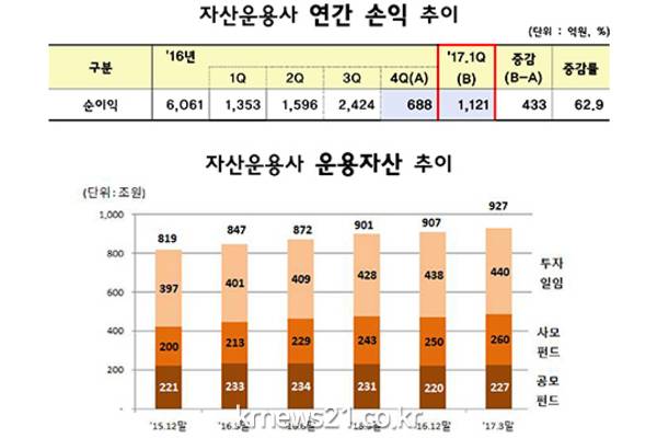 국내 자산운용사들이 올해 1분기 1121억원의 순이익을 거둔 것으로 나타났다. 이는 전 분기에 비해 62.9% 늘어난 액수다. 또 이들이 운용하는 자산 규모는 3개월 새 20조원 늘어난 것으로 조사됐다.