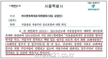 서울시는 최근 퀴어문화축제조직위원회에 보낸 ‘서울광장 사용수리 통보요청에 대한 회신’에서 “퀴어축제위가 2015∼2016년도 서울광장에서 개최한 퀴어축제와 관련해 시민 9만1000여명이 ‘서울시가 서울광장에서 불건전한 행사의 허가를 막고 책임 있는 업무를 해 달라’며 조례개정청구를 한 바 있다”고 설명했다. 이어 “금년에도 동일한 사유로 조례개정청구를 위한 주민서명이 진행되고 있다”면서 “사용수리에 대해서도 일부 시민이 민원을 제기하는 등 논란이 지속되고 있다”고 밝혔다.