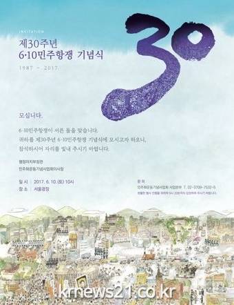 행정자치부는 10일 오전 10시 서울시청 앞 서울광장에서 1987년 6월 항쟁의 역사적 의미를 ‘기억’하고 더 나은 민주주의를 ‘다짐’하는 의미를 담은 ‘기억과 다짐’을 주제로 ‘6·10 민주항쟁 30주년 기념식’을 개최한다고 9일 밝혔다.