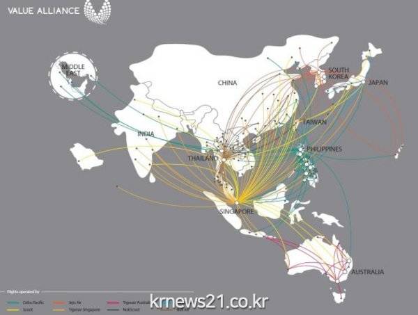 ▲ △ 밸류 얼라이언스 노선도 /사진제공=fnDB제주항공(대표이사 최규남)은 12일부터 아시아태평양 지역의 대표 LCC 7개사와 결성한 세계 최대의 LCC 동맹체 ‘밸류 얼라이언스(Value Alliance)’가 일부 서비스를 시작했다.