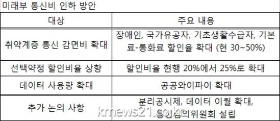 미래부는 현재보다 사회적 취약계층에 대한 음성, 데이터 통신비 인하 폭을 대폭 확대해 5000억원 이상의 통신비 인하효과를 끌어낸다는 복안이다.