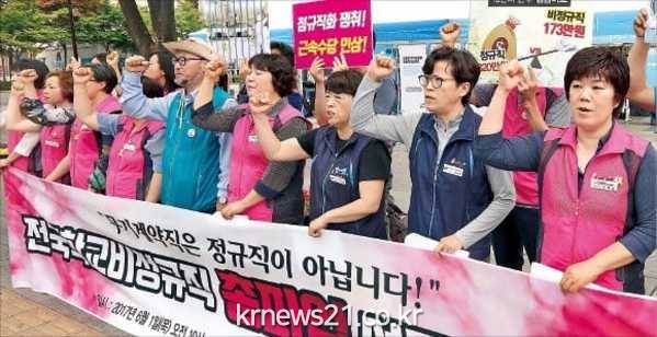 이들은 "비정규직은 근속이 쌓일수록 정규직과의 임금 격차가 심화한다. 근속수당을 근무 2년 차부터 지급하고 일 년에 5만원씩 인상해야 한다"며 처우 개선을 촉구했다.