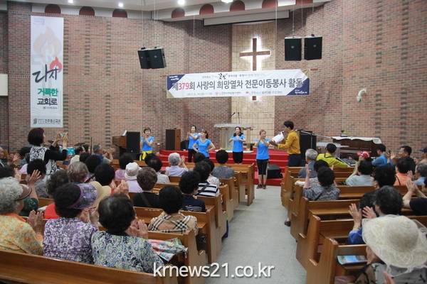 사단법인전주시자원봉사센터(이사장 황의옥)는 효자3동 동신교회에 찾아가 어르신 및 소외계층 200여명을 대상으로 문화공연과 점심나눔 봉사활동을 펼쳤다. 이날, 사랑의 희망열차는 전북이벤트MC협회(회장 임호영)의 진행으로 문화공연과 생활체조를 선보여 어르신들의 마음을 사로잡았으며, 나눔서금요법봉사회(회장 김정애), 귀반사건강봉사단(회장 여영만)의 전문봉사자 20여명이 어르신들의 건강을 관리해주는 민간요법 봉사활동을 펼쳤다. 또한, 200여명의 지역어르신들에 효자3동 자생단체 봉사자 50여명과 함께 맛있는 육개장을 대접했다.
