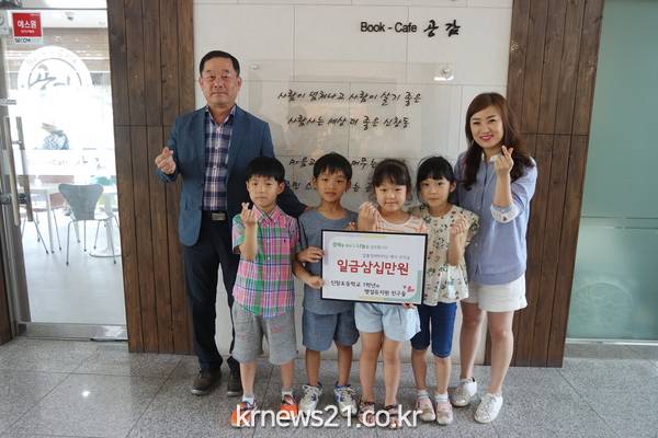 신창동에 따르면 신창초등학교 1학년 학생들과 이 학교 병설유치원생들은 지난 21일 동주민센터를 찾아 이웃돕기 성금 30만원을 내놓았다. 초등생과 유치원생들은 지난 1일 학교에서 알뜰경제 한마당에서 얻은 수익금 일부를 성금으로 마련했다.