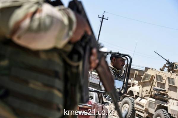 이라크 군이 IS와 전투를 벌이고 있는 모술 지역에서 거리를 순찰하고 있다. IS는 21일(현지시간) 이라크군이 포위망을 좁혀가고 있는 모술 서부의 알누리 모스크를 폭파했다.