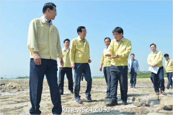 김용진 기획재정부 2차관은 23일 충청남도 서산시 대호 담수호를 방문, 대산산업용수센터에서 가뭄피해 현황 브리핑을 받고 피해농민과 산단 관계자들의 건의사항과 정부 가뭄대책에 대한 현장 의견을 청취하는 자리에서 이같이 말했다.