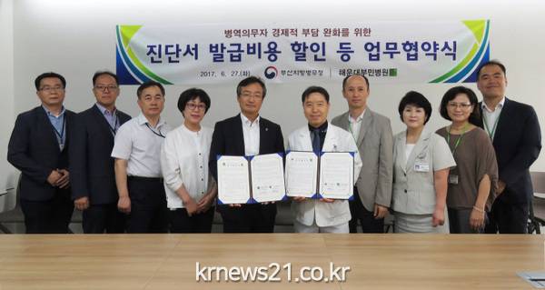 부산지방병무청은 28일, 해운대구에 위치한 해운대부민병원(병원장 서승석)과 병무용진단서 발급비용 등 할인을 위한 업무협약식을 가졌다.